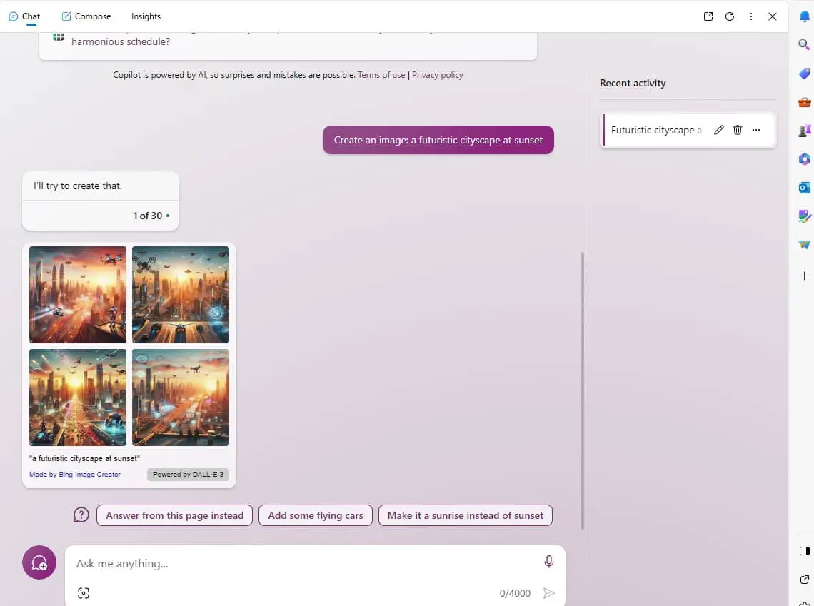 Вы можете ввести Создать изображение: футуристический городской пейзаж на закате. Вы также можете внести изменения в только что созданное изображение.