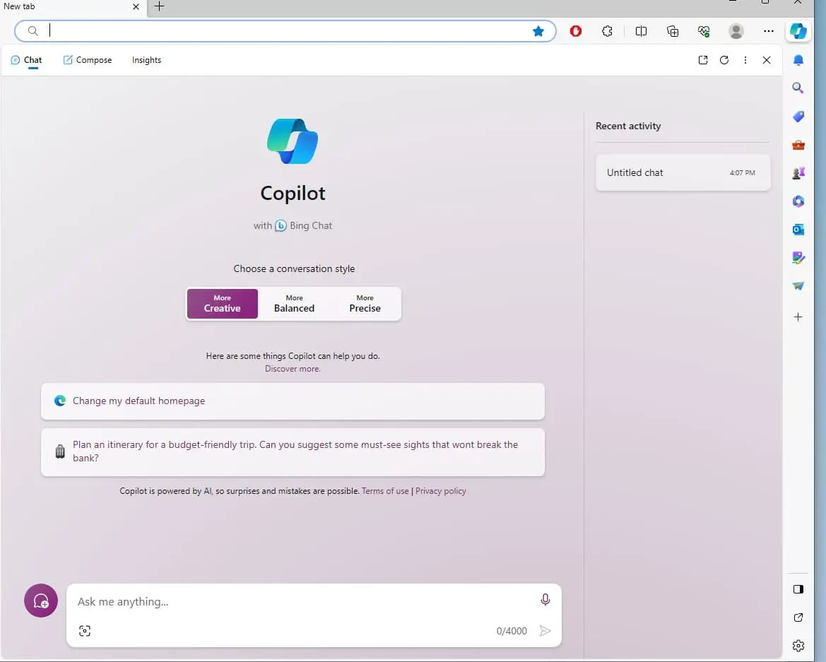 Edge Copilot основан на Bing Chat. Чтобы бесплатно использовать ChatGPT 4 в Edge, вам необходимо выбрать «Творческий» режим Edge Copilot. Затем вы можете ввести приглашение или запрос в окно чата и дождаться ответа Bing. Bing будет использовать ChatGPT 4 для создания интересных, занимательных и увлекательных ответов.