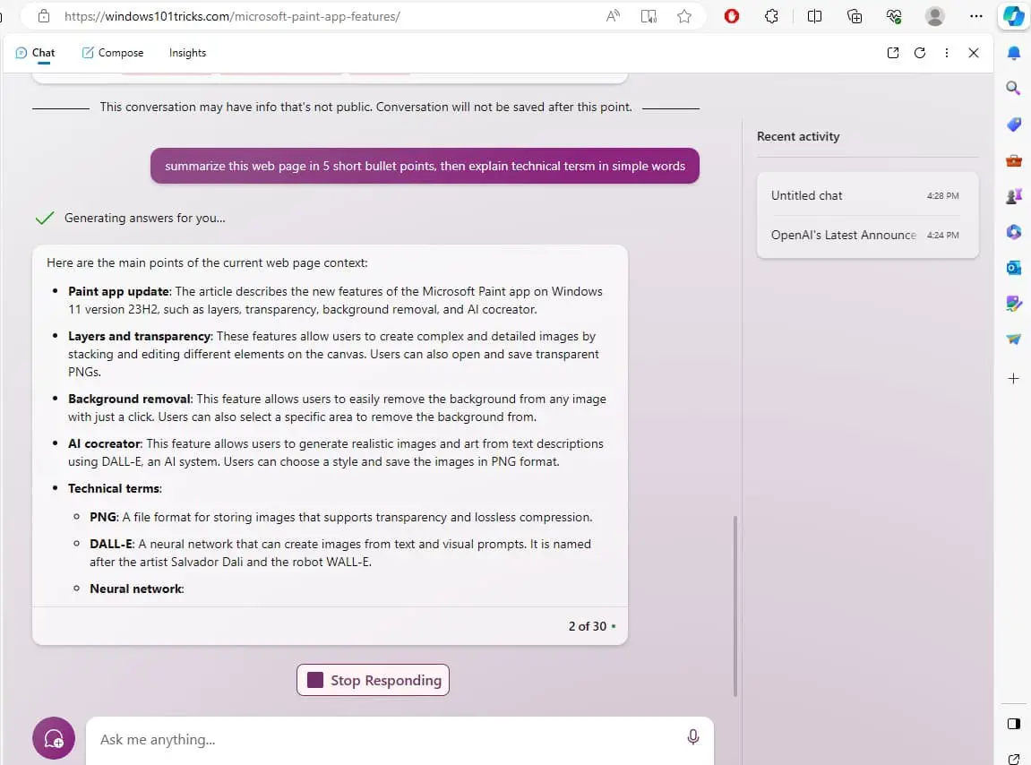 Вы также можете попросить Bing помочь вам переписать, улучшить или оптимизировать ваш контент. Например, если вы хотите подвести итог и объяснить веб-страницу, перейдите на нужную веб-страницу, щелкните значок «Второй пилот» и попросите Bing суммировать ее для вас. Bing будет использовать GPT-4 для создания краткого описания веб-страницы и объяснения ее основных моментов.