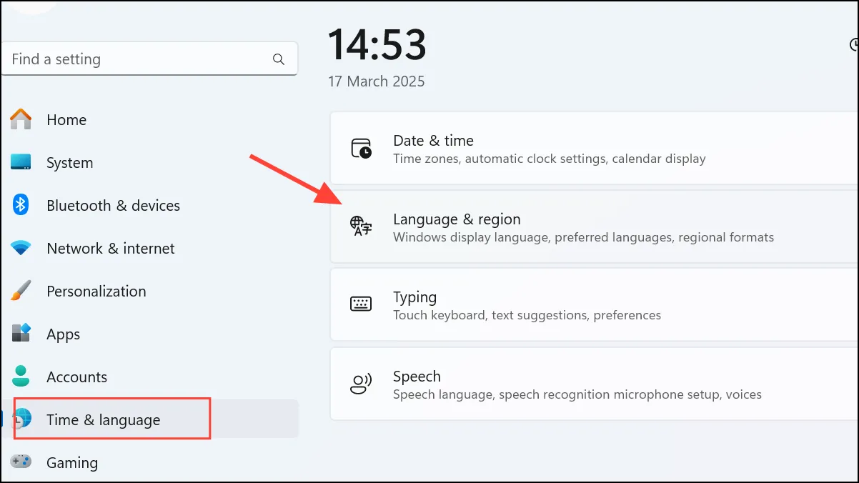Шаг 1: Откройте приложение «Параметры» Windows 11, нажав Win+I. Перейдите в раздел «Время и язык» > «Язык и регион».