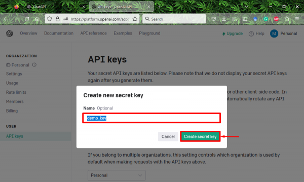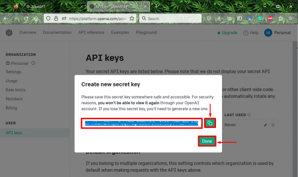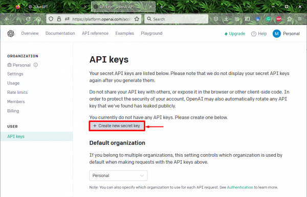 Примечание. После создания ключа API сохраните его где-нибудь, поскольку после его создания пользователи не смогут снова увидеть его через учетную запись OpenAI.