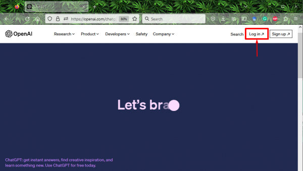 Прежде всего, откройте предпочитаемый вами браузер, посетите ключевую страницу OpenAI и нажмите кнопку «Войти»: