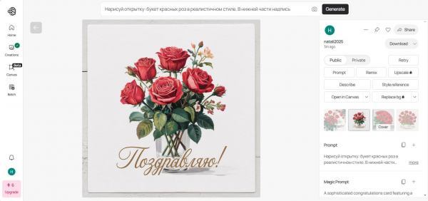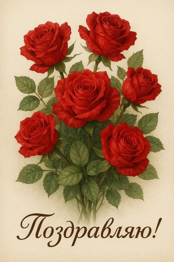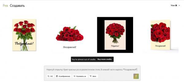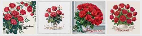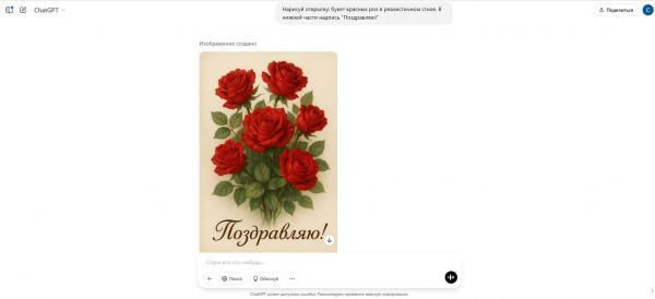 Для тестирования будем использовать один и тот же промт на русском языке: «Нарисуй открытку: букет красных роз в реалистичном стиле. В нижней части надпись «Поздравляю»».